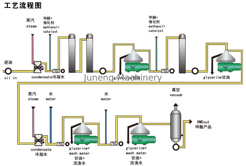 Από το έλαιο και το λίπος adoptin ως πρώτες ύλες, το βιολογικό πετρέλαιο diesel επιτυγχάνεται μέσω etherification της αντίδρασης με τη μεθανόλη με την προσθήκη του αλκαλικού καταλύτη. Η γλυκερίνη που παράγεται στην αντίδραση είναι ένα θυγατρικό προϊόν.